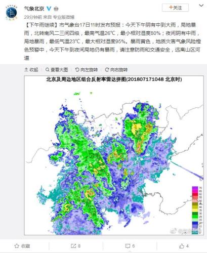 北京市氣象臺17日11時發布預報:今天下午陰有中到大雨,局地暴雨,北轉南風二三間四級,最高氣溫26℃,最小相對濕度80%;夜間陰有中雨,局地暴雨,最低氣溫23℃,最大相對濕度95%。已發布暴雨黃色、地質災害氣象風險橙色預警。