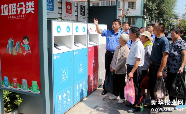 2018年7月13日,宿遷市宿豫區城管局的城管人員正在“垃圾分類站”現場引導居民分類、投放垃圾。孫東城 攝 視覺江蘇網供圖