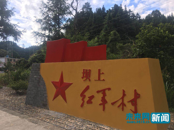 經過顛簸的盤山水泥公路,走進群山環繞的茅坪鄉壩上村,小橋流水、田野房屋相間,紅瓦白墻上的8幅手繪圖生動展現著紅軍故事,道路兩邊插滿了紅旗,成片的荷花在荷塘綻放,溪水之上,小橋與石墻之間,農戶用鐵絲拉網,種起了野生獼猴桃和絲瓜。這里每天都有很多游客過來體驗紅軍生活,聆聽紅軍故事、做紅軍飯、走紅軍路,因此壩上村又叫紅軍村。