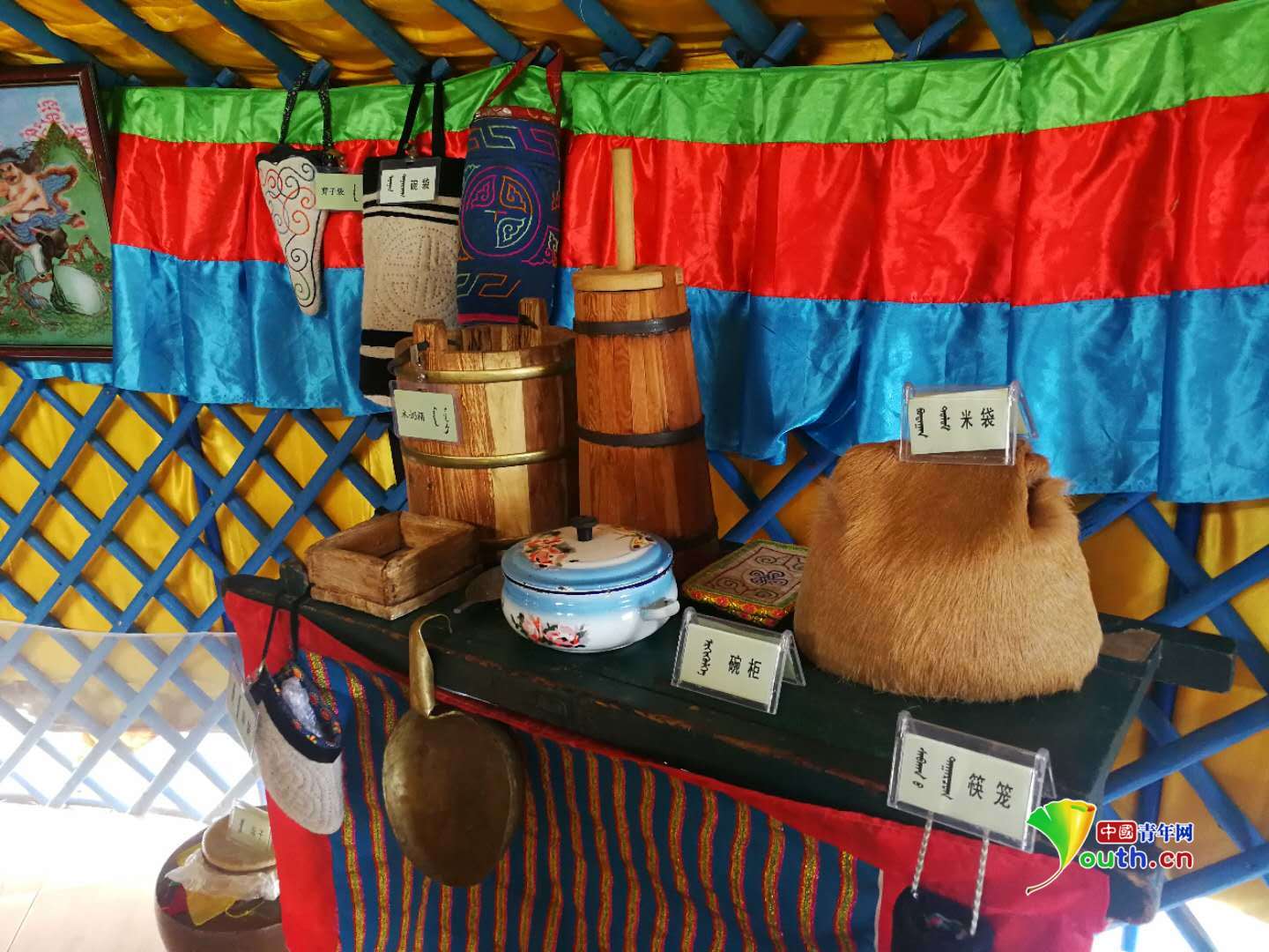 為了讓自家的旅游服務做的更好,蘇·呼格吉勒圖專門設計了一個獨特的蒙古包“展廳”,里面全是牧民生產工具和生活用品:接羊羔的氈口袋、做酸奶的竹筒、弓箭、燭臺、皮口袋、搖籃等等。作為一個熱愛傳統民俗的牧人,蘇.呼格吉勒圖把這些帶有蒙古族文化元素的“寶貝”一一收集起來,讓每一位來到這里的游客都能親身體驗到傳統游牧文化的魅力。