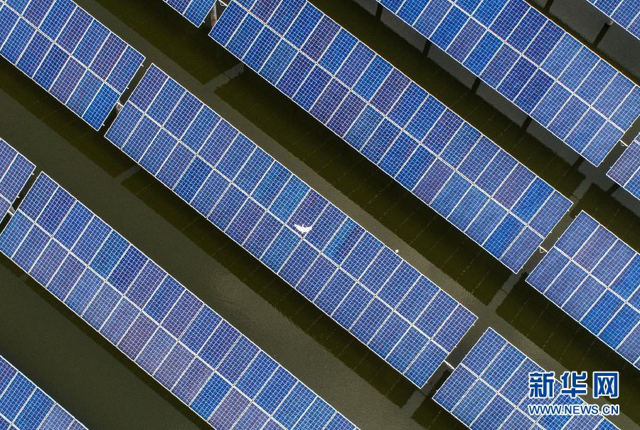 一只白鷺從光伏板上飛過(6月21日攝)。浙江省湖州市和孚鎮的“漁光互補”光伏發電項目建設在4200多畝魚塘上,40多萬塊太陽能光伏板下養殖小龍蝦和青蝦等水產,千畝魚塘與綠色光伏電站構成一幅和諧的生態美景圖。 新華社記者 徐昱 攝