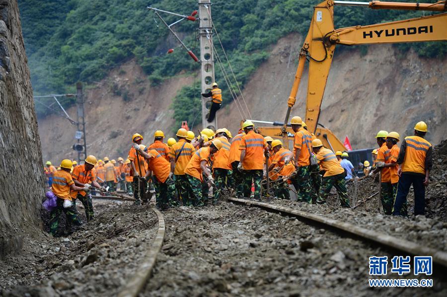 7月28日,搶險人員在寶成鐵路山體崩塌搶險現場進行搶修作業。新華社發(唐振江 攝)