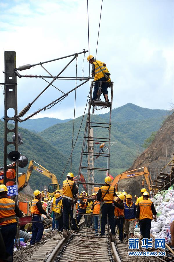 7月28日,搶險人員在寶成鐵路山體崩塌搶險現場進行搶修作業。新華社發(唐振江 攝)