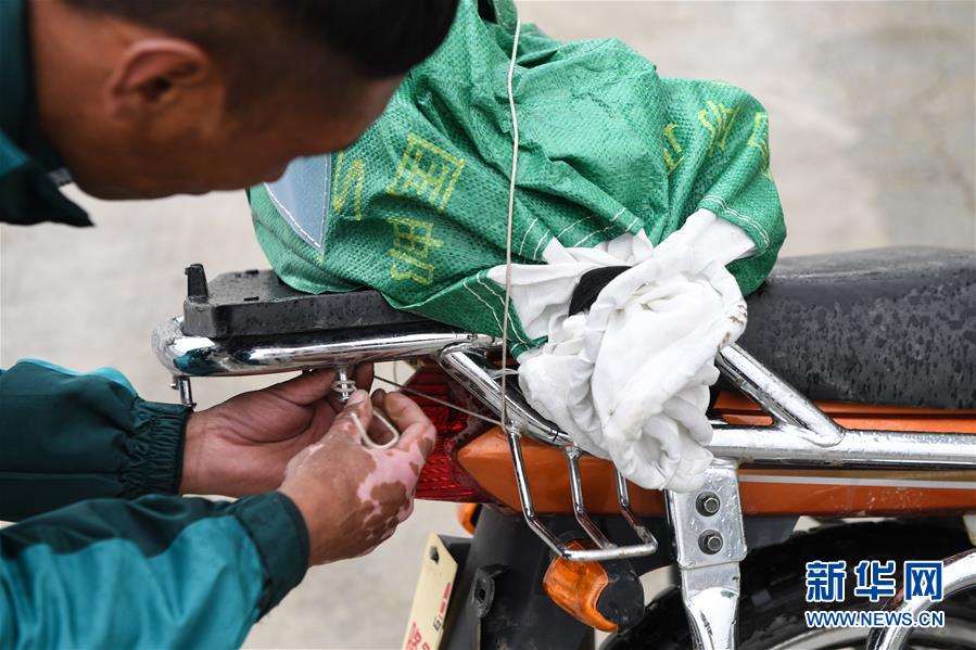 為了防止道路顛簸損壞郵包,投遞員格桑次仁將郵包牢固地捆扎在摩托車的尾部(7月23日攝)。新華社記者 李賀 攝
