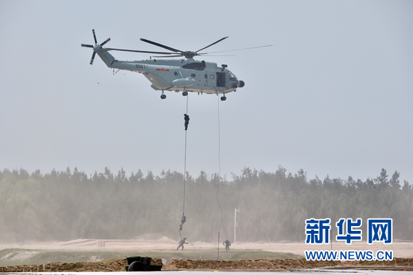 7月29日,在福建泉州賽區開幕式上,中國海軍陸戰隊在三棲立體登陸作戰課目軍事表演中搭乘艦載直升機滑降。當日,“國際軍事比賽-2018”中國承辦賽事開幕式分別在新疆庫爾勒市和福建泉州市舉行。 新華社記者 姜克紅 攝