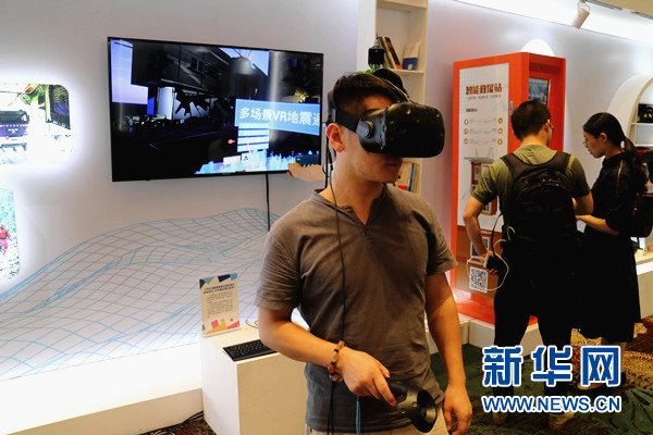 圖為參展人員體驗VR地震模擬器。新華網汪亞/攝
