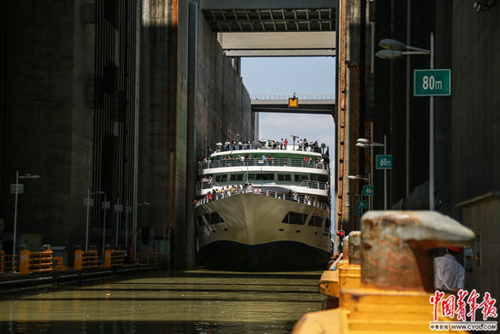 7月31日,湖北省宜昌市,船只準(zhǔn)備進(jìn)入三峽大壩升船機(jī),進(jìn)入廂體后這艘100多米長(zhǎng)的客船將乘升船機(jī)下降80多米,“翻越”大壩。三峽升船機(jī)是世界上規(guī)模最大的升船機(jī),也是三峽工程的收官之作。中國(guó)青年報(bào)·中青在線記者 趙迪/攝