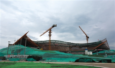 目前,中國館主體結構、鋼結構已完成施工,室外部分正在進行梯田堆筑、石籠擋墻施工;室內部分正在進行裝修工程的施工和屋面玻璃幕墻施工。
