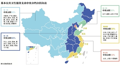 基本公共衛生服務支出責任實行中央分檔分擔辦法:第一檔包括內蒙古、廣西、重慶等12個省(自治區、直轄市),中央分擔80%;第二檔包括河北、山西等10個省,中央分擔60%;第三檔包括遼寧、福建、山東3個省,中央分擔50%;第四檔包括天津、江蘇等,中央分擔30%;第五檔包括北京、上海2個直轄市,中央分擔10%。