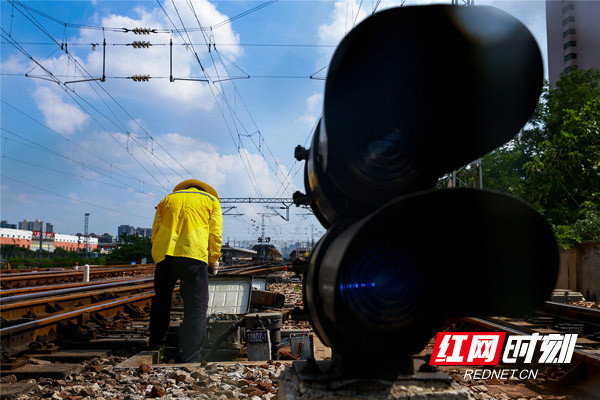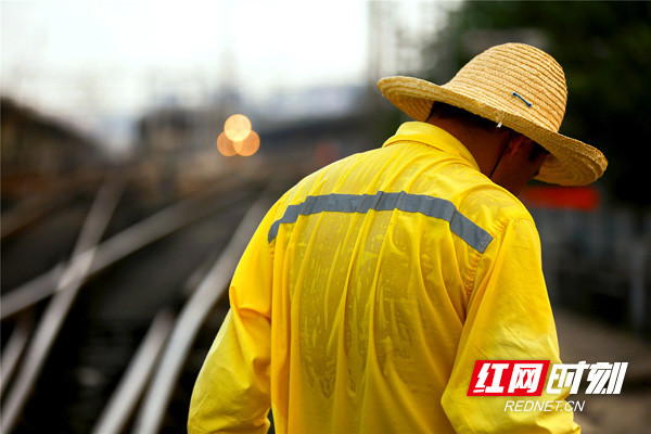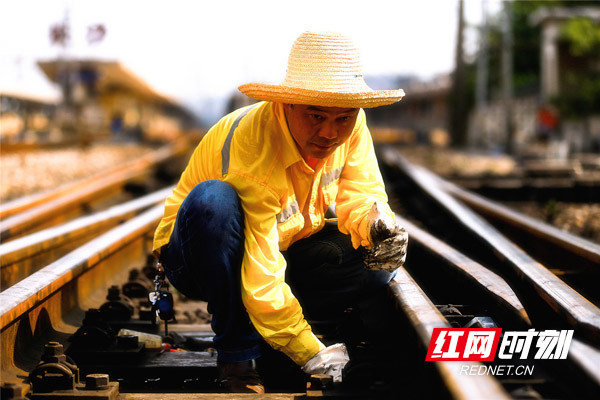 在相隔不到20米的作業地點,長沙信號工區工長胡正海帶領工友們對另一處道岔、軌道電路等設備進行巡視和設備注油作業。“人會因高溫天氣顯得更加疲憊,設備也會受到高溫天氣的影響,所以無論太陽多么炙熱,設備巡視必不可少。”胡正海一邊擦汗一邊介紹。