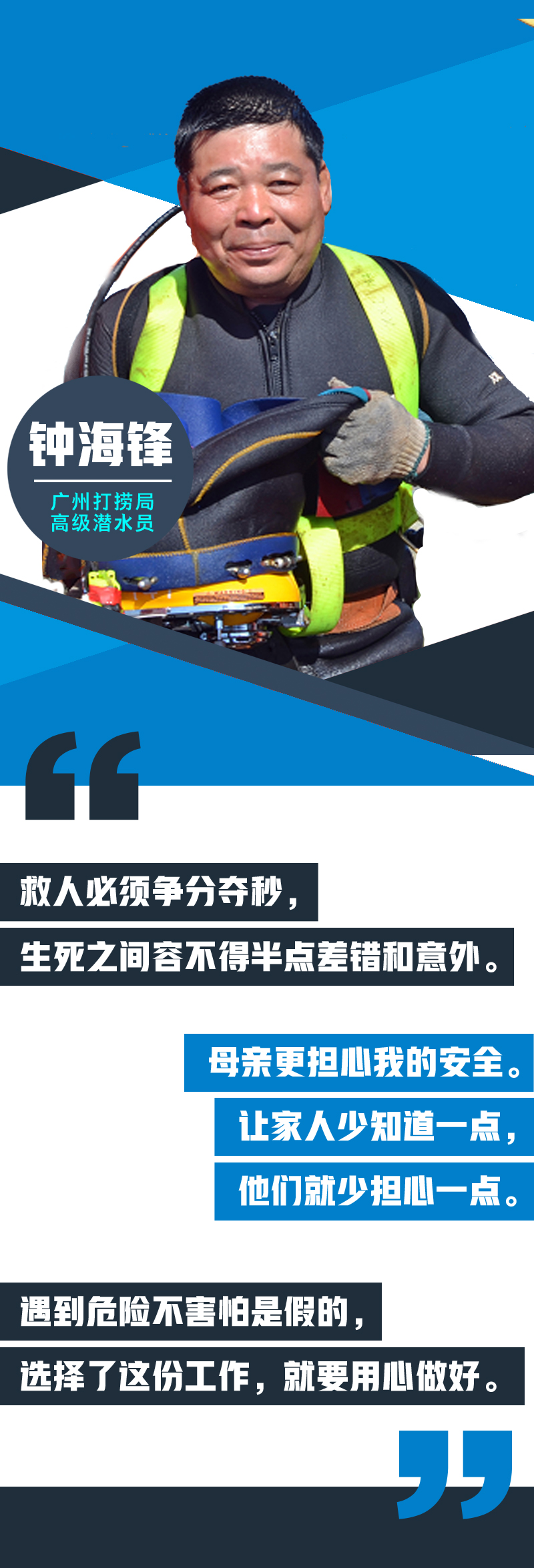 鐘海鋒是廣州打撈局高級潛水員。28年間,救人和打撈工作布滿了他的職業(yè)履歷。在他的手中,命懸一線的生命重獲生機,千噸級的沉船重見天日。