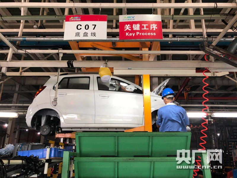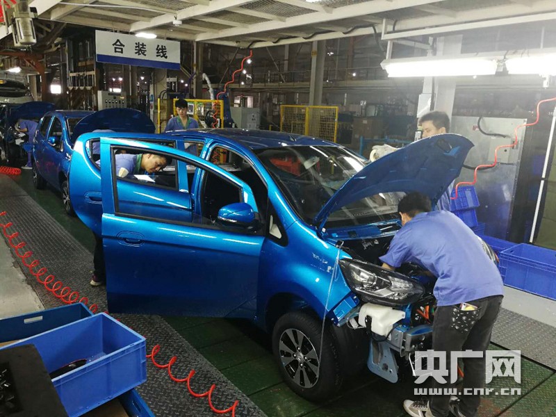 總裝廠內,工人正在組裝新能源車。合裝線主要負責機艙三電系統的安裝,是整車下線檢驗前的最后一道工序組,裝好的新能源汽車可以開往試車跑道進行試行,檢驗新車是否符合下線售賣標準。(記者 李澎攝)