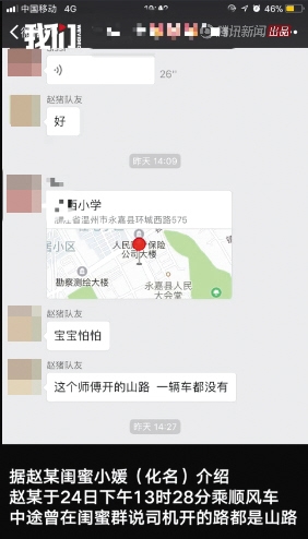 趙某的朋友小李(化名)整理了事情發生的過程。8月24日13時30分,趙某表示已坐上順風車。14時29分,趙某在微信群中表示進入無人山區并發來“怕怕”,“這個師傅開的山路,一輛車都沒有”的信息,14時14分時發出“救命”、“搶救”。