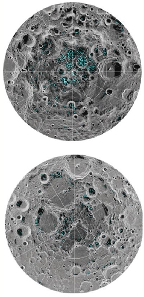 圖中淺藍色區域就是發現水冰的地方,上圖為月球南極,下圖為月球北極。圖/NASA