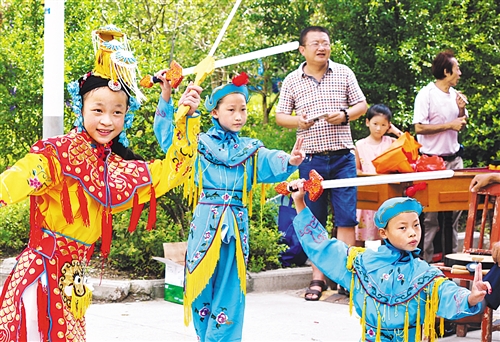 江蘇省海安市經(jīng)濟技術(shù)開發(fā)區(qū)戲曲小票友在社區(qū)為居民表演京劇,豐富假日生活。 李曉亮攝