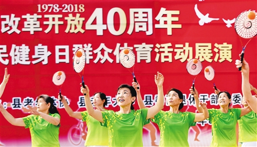 湖北省襄陽市南漳縣舉行群眾體育活動展演。上千名干部群眾分別展示了太極拳劍、健身氣功、柔力球、廣場舞等精彩節(jié)目,紀念改革開放40周年。 熊明銀攝