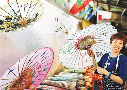 貴州省赤水市大同古鎮(zhèn),油紙傘傳人李珍霞在展示她制作的油紙傘。大同古鎮(zhèn)歷史悠久,擁有“獨竹漂”、竹編、油紙傘等非物質(zhì)文化遺產(chǎn)。 經(jīng)濟日報-中國經(jīng)濟網(wǎng)記者 周明陽攝