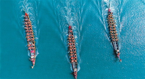 安徽省池州市舉辦的龍舟賽。龍舟競渡是長江流域影響最大、流傳最廣的民俗之一,體現(xiàn)了我國悠久的歷史文化傳承和百舸爭流、勇往直前的競進精神。 饒 頤攝