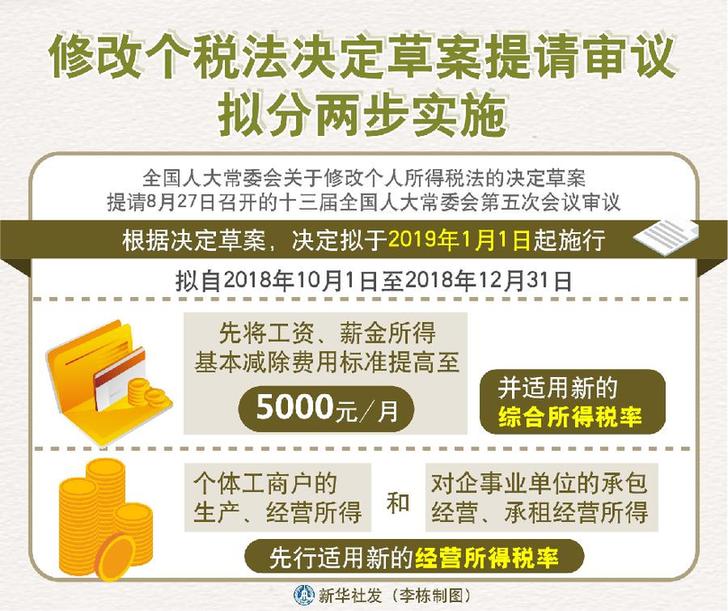 新華社北京8月27日電(記者韓潔、郁瓊源)全國人大常委會關于修改個人所得稅法的決定草案提請27日召開的十三屆全國人大常委會第五次會議審議。該決定擬自2019年1月1日起施行,但部分減稅政策擬于2018年10月1日起先行實施。