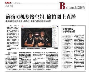 2016年,新京報曾報道過有滴滴司機在“熊貓TV”進行邊開車邊直播的行為。當時,這名滴滴司機在車內安裝了一只隱藏的攝像頭,每晚11點左右準時守候在首都機場外,專門接空姐訂單。而他直播的內容,正是其在車內與空姐聊天的過程。由于直播內容涉嫌侵犯乘客隱私,滴滴公司已對這名司機做出了“即刻封禁”的處理,“熊貓TV”平臺也于第一時間對涉事主播做出封停處理,并對事件中的空姐表示歉意。