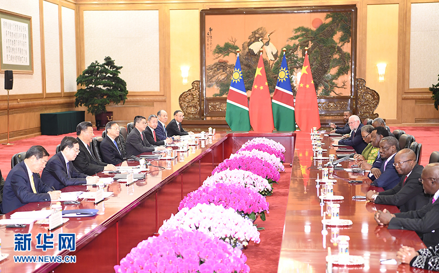 習(xí)近平強(qiáng)調(diào),今年3月總統(tǒng)先生訪華,我們共同宣布將中納關(guān)系提升為全面戰(zhàn)略合作伙伴關(guān)系,并對兩國合作作出全面規(guī)劃。我很高興雙方達(dá)成的各項共識都在有序落實。中方愿同納方繼續(xù)保持高層交往勢頭,在涉及彼此核心利益和重大關(guān)切問題上相互理解、相互支持。雙方要加強(qiáng)發(fā)展戰(zhàn)略對接,深化互利共贏合作,加強(qiáng)人文交流。在共建“一帶一路”和中非合作論壇框架內(nèi),推進(jìn)基礎(chǔ)設(shè)施建設(shè)和產(chǎn)能領(lǐng)域合作。中方支持納方實現(xiàn)國家進(jìn)一步發(fā)展的努力,愿同納方加強(qiáng)在國際和地區(qū)事務(wù)中的溝通協(xié)調(diào)。