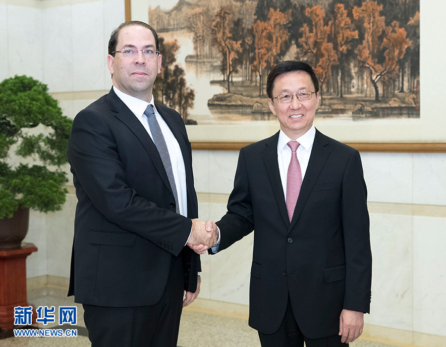 9月5日,中共中央政治局常委、國務院副總理韓正在北京釣魚臺國賓館會見突尼斯總理沙赫德。 新華社記者 王曄 攝