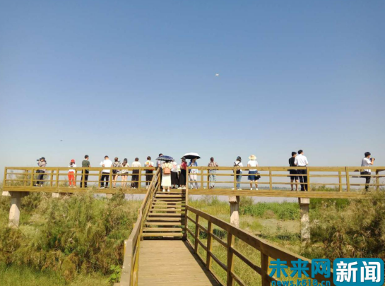 采訪團(tuán)記者們登上瞭望塔拍攝保護(hù)區(qū)內(nèi)的鳥兒。 未來網(wǎng)記者 劉文靜 攝