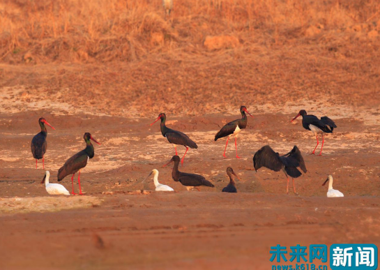河南省孟津縣黃河濕地國家級自然保護(hù)區(qū)內(nèi)的黑鸛(黃河濕地孟津管理局供圖)
