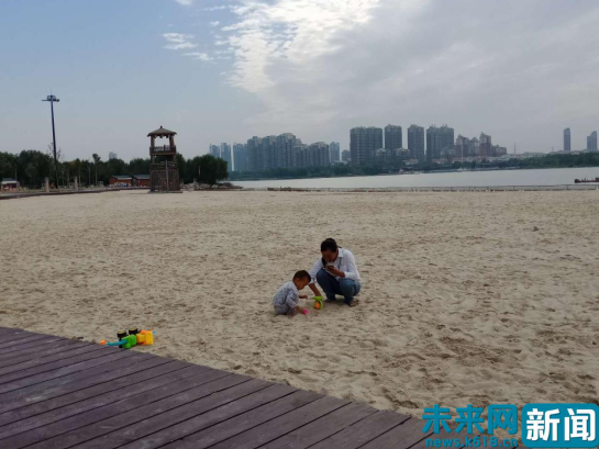 一位年輕的媽媽帶著孩子在沙灘上玩耍。未來網(wǎng)記者 劉文靜 攝