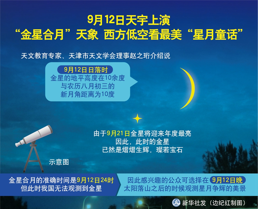 新華社天津9月10日電(記者周潤健)天文專家介紹說,作為行星合月里最美的一幕“星月童話”,“金星合月”12日晚將現(xiàn)身天宇,映美蒼穹。如果天氣晴好,感興趣的公眾抬頭仰望西方低空,憑借肉眼就可欣賞到“維納斯”與“月姑娘”相依相伴的美妙場景。