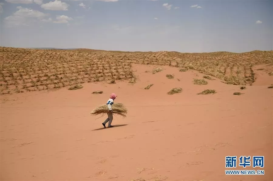 覆蓋在騰格里沙漠上的麥草方格沙障。