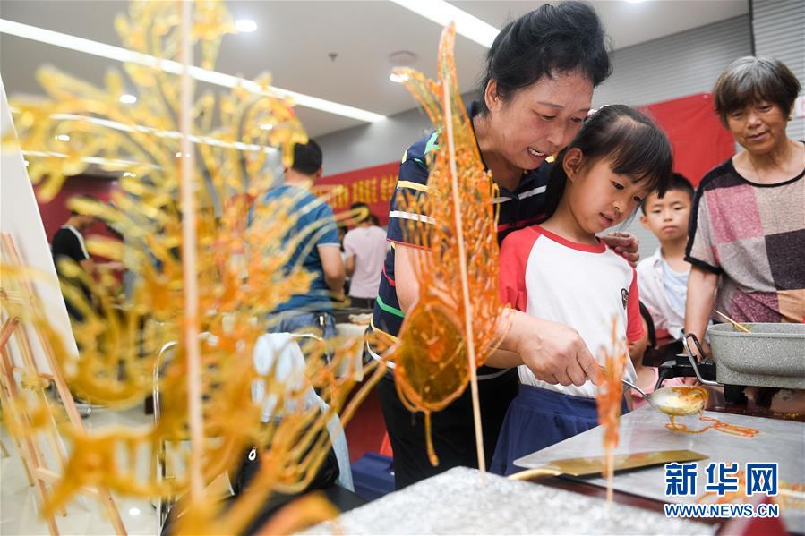 非遺傳承人張云萍(左)在教小朋友進行糖畫創(chuàng)作