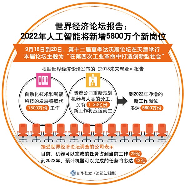 圖表:世界經濟論壇報告:2022年人工智能將新增5800萬個新崗位 新華社發 邊紀紅 制圖