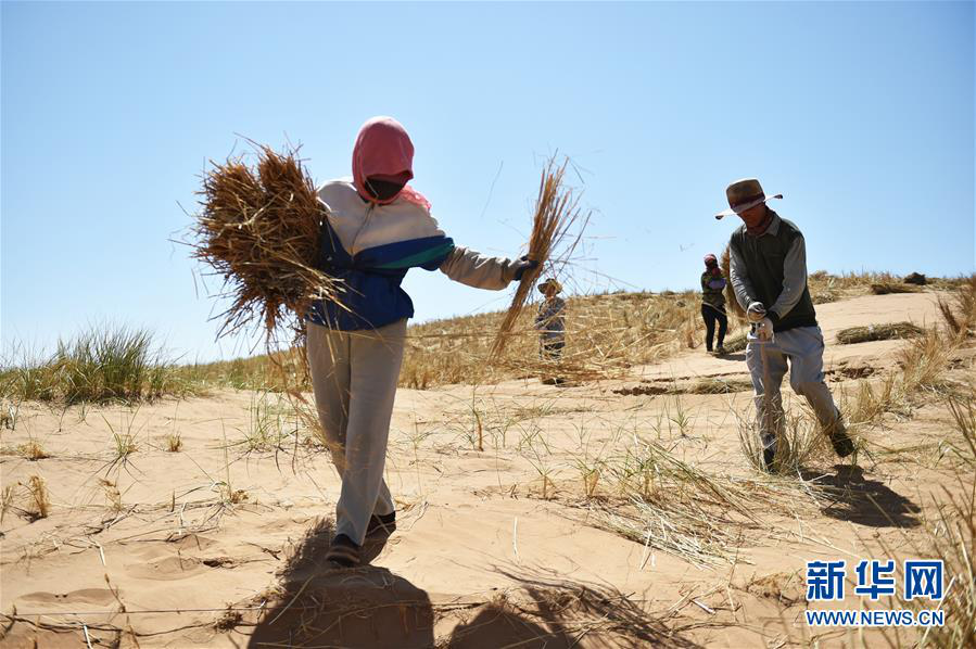 寧夏中衛市沙坡頭區黑林村村民林治福(右)和周紅正在騰格里沙漠扎草方格(6月11日攝)。? 新華社記者盧鷹攝