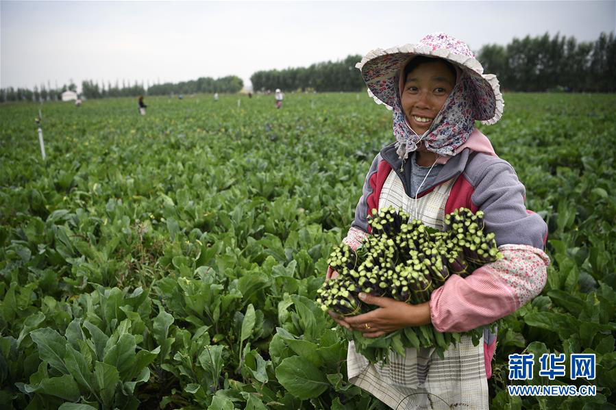 在固原市原州區彭堡鎮姚磨村,村民在蔬菜基地收獲蔬菜(8月27日攝)。? 新華社記者王鵬攝