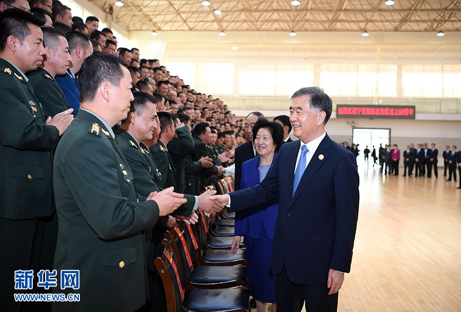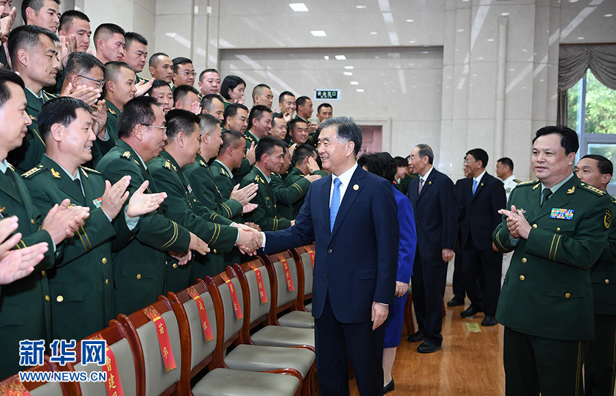 9月19日,中共中央政治局常委、全國政協主席、中央代表團團長汪洋率代表團部分成員分別赴寧夏軍區、武警寧夏總隊慰問,并會見自治區政法系統代表。這是汪洋慰問武警寧夏總隊官兵代表。 新華社記者 張領 攝