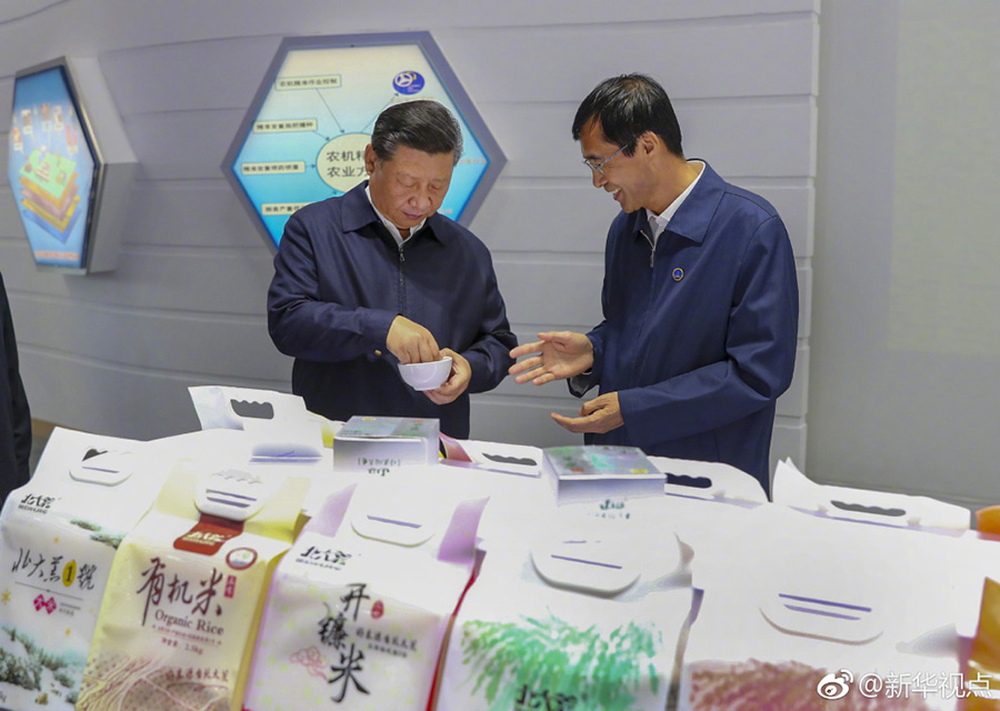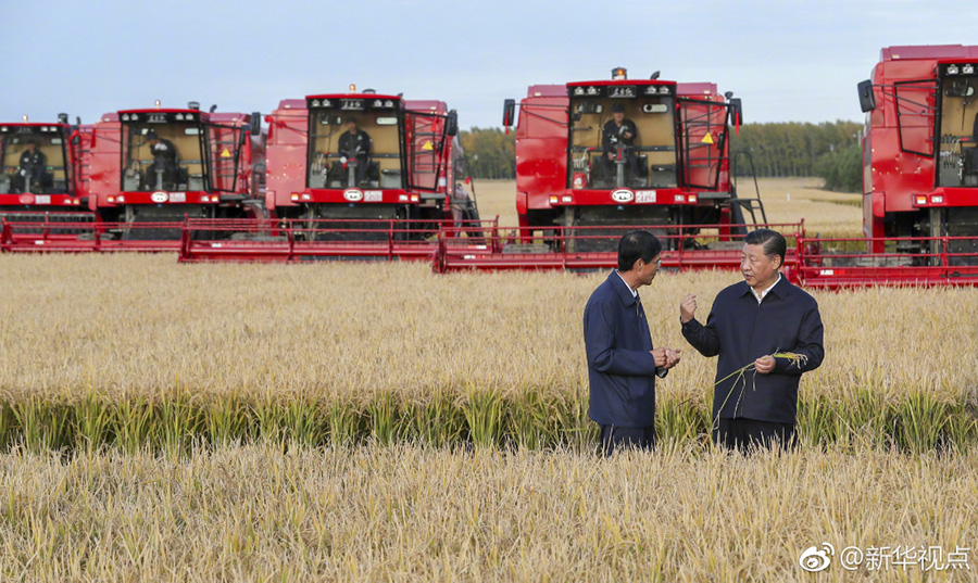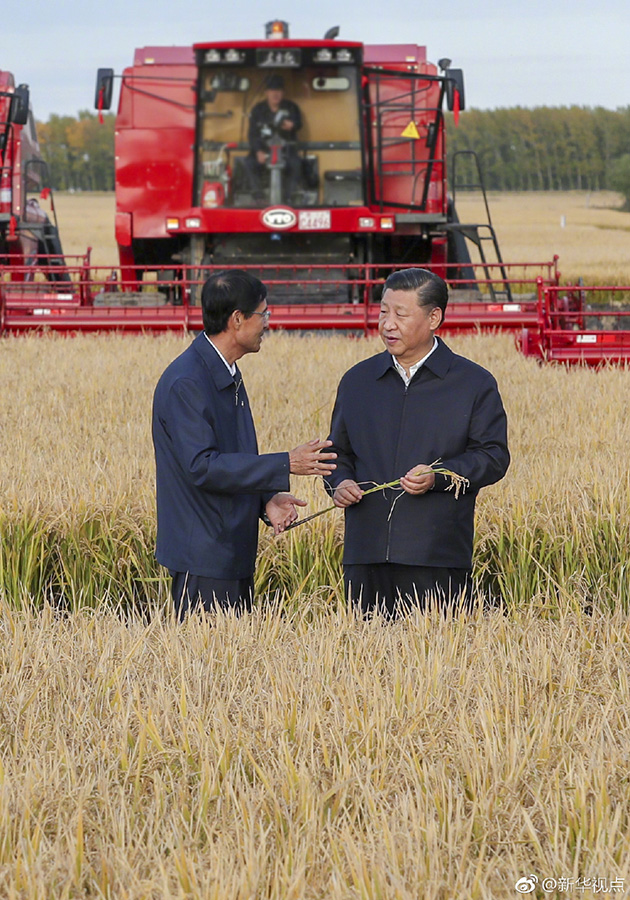25日下午,首個“中國農(nóng)民豐收節(jié)”剛過,習(xí)近平就深入三江平原腹地黑龍江農(nóng)墾建三江管理局,考察糧食生產(chǎn)和收獲情況。他邊聽介紹,邊向農(nóng)場負(fù)責(zé)人詢問今年收成如何、有沒有病蟲害、能否做到連年豐收,并強調(diào)中國人的飯碗任何時候都要牢牢端在自己的手上。在北大荒精準(zhǔn)農(nóng)業(yè)農(nóng)機中心一樓大廳,當(dāng)?shù)爻霎a(chǎn)的米油豆奶等各類農(nóng)產(chǎn)品擺滿展臺。習(xí)近平走近前去,雙手捧起一碗大米,意味深長地說:“中國糧食,中國飯碗。”(文字:張曉松 攝影:謝環(huán)馳)