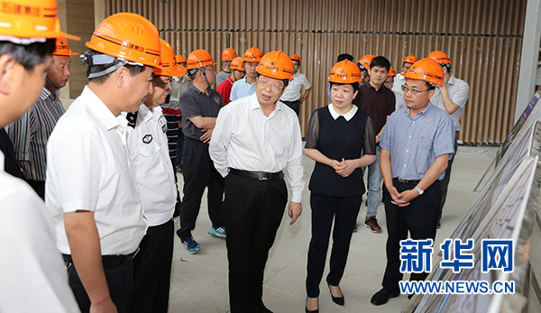 浙江省湖州市委副書記、市長(zhǎng)錢三雄(前右三)檢查位于德清縣的首屆聯(lián)合國(guó)世界地理信息大會(huì)項(xiàng)目建設(shè)(2018年6月10日攝)。新華社發(fā)