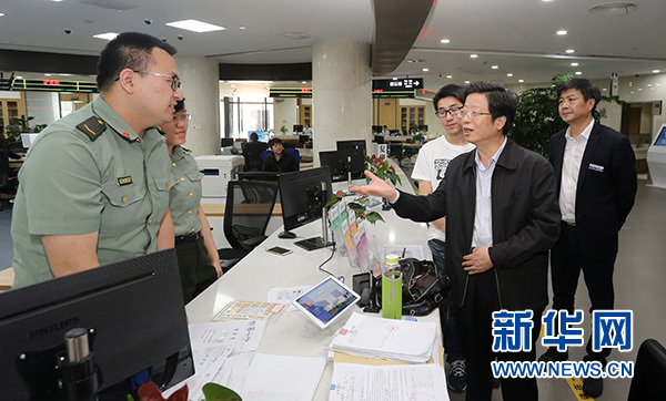 浙江省湖州市委副書記、市長(zhǎng)錢三雄(右二)在湖州市民服務(wù)中心調(diào)研指導(dǎo)“最多跑一次”改革工作(2017年5月10日攝)。新華社發(fā)