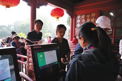 9月28日,香山公園,游客驗(yàn)票入園。今年國(guó)慶假期,香山公園每日最大游客承載量為10.1萬(wàn)人。新京報(bào)記者 侯少卿 攝