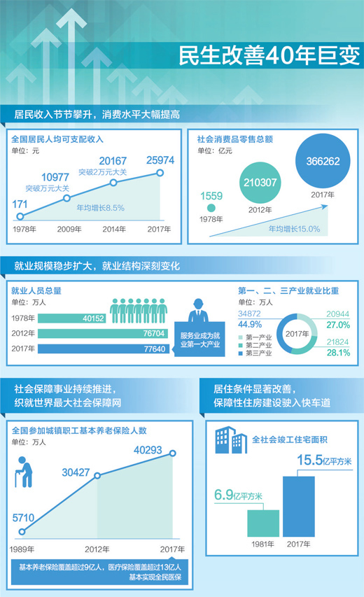 改革開放40年,是我國經(jīng)濟(jì)飛速發(fā)展、經(jīng)濟(jì)總量連上新臺階的40年,也是全體人民共享改革發(fā)展成果、生活水平大幅提高的40年。黨的十八大以來,以習(xí)近平同志為核心的黨中央堅持以人民為中心的發(fā)展思想,統(tǒng)籌做好就業(yè)、收入分配、社會保障、醫(yī)療衛(wèi)生等各領(lǐng)域民生工作,城鄉(xiāng)居民生活向全面小康社會更加扎實(shí)地邁進(jìn)。人民群眾的獲得感、幸福感、安全感更充實(shí)、更有保障、更可持續(xù)。