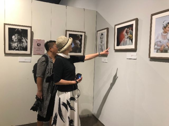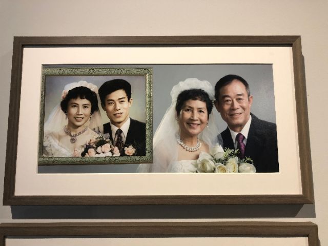 展廳內的一幅新舊婚照對比圖引起了觀眾們的注意,作品中左邊的照片是一對新人于1980年拍攝的婚照,右邊是這對夫婦于今年以同樣角度、同款風格拍攝的一張婚照。對比之下,雖然曾經的“新人”容顏漸老,但幸福依舊。
