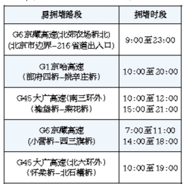 根據(jù)高德地圖交通大數(shù)據(jù)預(yù)測 ,國慶節(jié)期間北京市返程易擁堵緩行的高速有G6京藏高速、G1京哈高速、G45大廣高速、G4京港澳高速等部分路段。