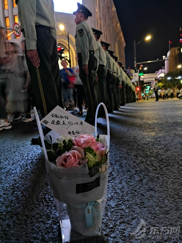 10月4日晚21時(shí)10分,在南京路步行街十字路口,一位姑娘手捧鮮花走執(zhí)勤官兵面前:“辛苦你們,這束花送給你們!”放下轉(zhuǎn)身便消失在人群之中。當(dāng)執(zhí)勤官兵拿起鮮花時(shí)驚喜地發(fā)現(xiàn),里面還夾了一張?zhí)刂频拿餍牌?,娟秀的字跡寫到:“長假和你,是最美麗的風(fēng)景。辛苦啦~比心~”
