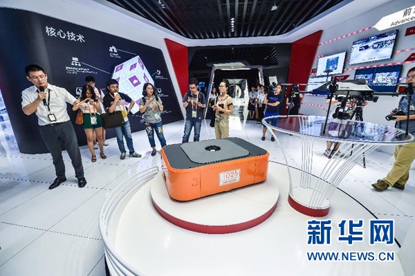 杭州海康威視數(shù)字技術(shù)股份有限公司工作人員向記者介紹公司研發(fā)的物流機(jī)器人(2016年9月2日攝)。新華社記者 徐昱 攝
