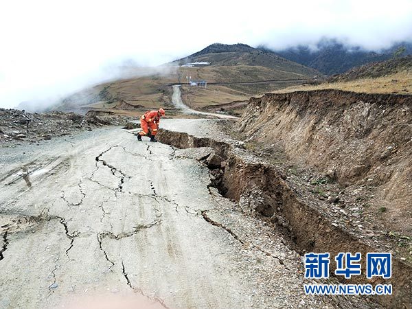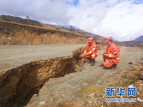 先遣隊(duì)員在波公村勘察地質(zhì)災(zāi)害情況(10月12日攝)。 新華社發(fā)(夏能 攝)