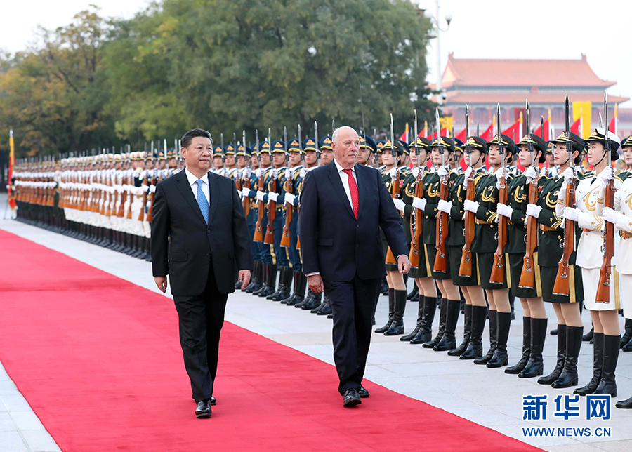 10月16日,國家主席習近平在北京人民大會堂同挪威國王哈拉爾五世舉行會談。這是會談前,習近平在人民大會堂東門外廣場為哈拉爾五世舉行歡迎儀式。 新華社記者 劉衛兵 攝