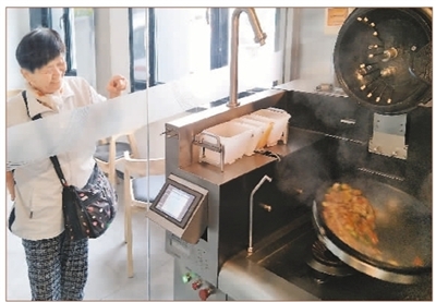 這位神秘的“大廚”就是智能炒菜機器人。它身懷兩大“絕活”,一是內置攪拌鏟,可以模仿大廚翻炒,全程不需要人工參與,而且食物攪拌比人工更均勻;二是全程沒有油煙。炒菜機器人內置了海量食譜,可以勝任大多數家常菜。試吃之后,我覺得味道還不錯,很適合老年人吃。