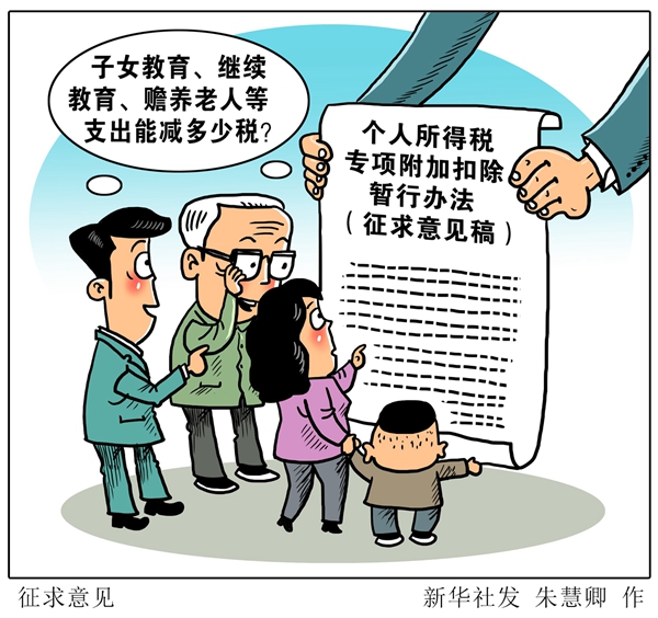 新華社北京10月20日電(記者 韓潔、劉紅霞)新一輪個(gè)人所得稅改革的一大亮點(diǎn)——專項(xiàng)附加扣除政策20日揭開面紗。當(dāng)天起,財(cái)政部、國(guó)家稅務(wù)總局會(huì)同有關(guān)部門起草的《個(gè)人所得稅專項(xiàng)附加扣除暫行辦法(征求意見稿)》在兩部門官網(wǎng)開始為期兩周的向全社會(huì)公開征求意見。
