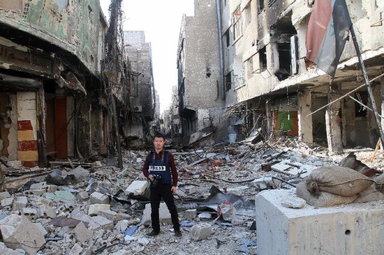 圖為陳聰在敘利亞戰場前線采訪。